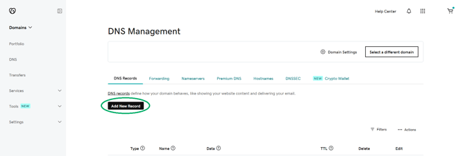 For example, if your domain registrar is GoDaddy, you would click your name at the top right > My Products > click DNS next to the domain listed > Add new record.