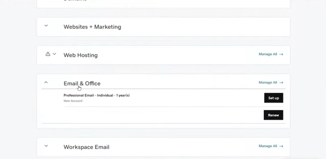 Once you purchase the email, you will find Email & Office in your product section. Click on this section to begin setup of your professional email.