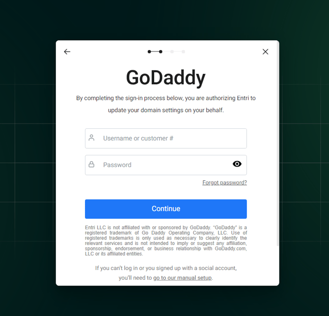 Enter your domain. Entri will automatically recognize the domain registrar your domain is under and will ask you to login to verify authorization to update the domain settings.