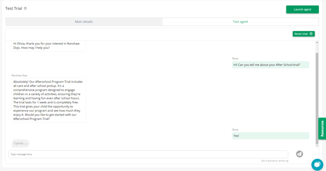 If you would like to see an example conversation with the chatbot before publishing the agent, you can click “Test agent.” Enter a fake lead name and program interest and then have a chat with your agent. This is purely a simulation of how the agent will interact with customers and will not affect your system or actually complete registrations.